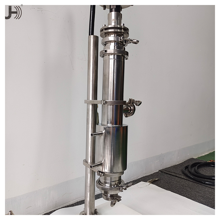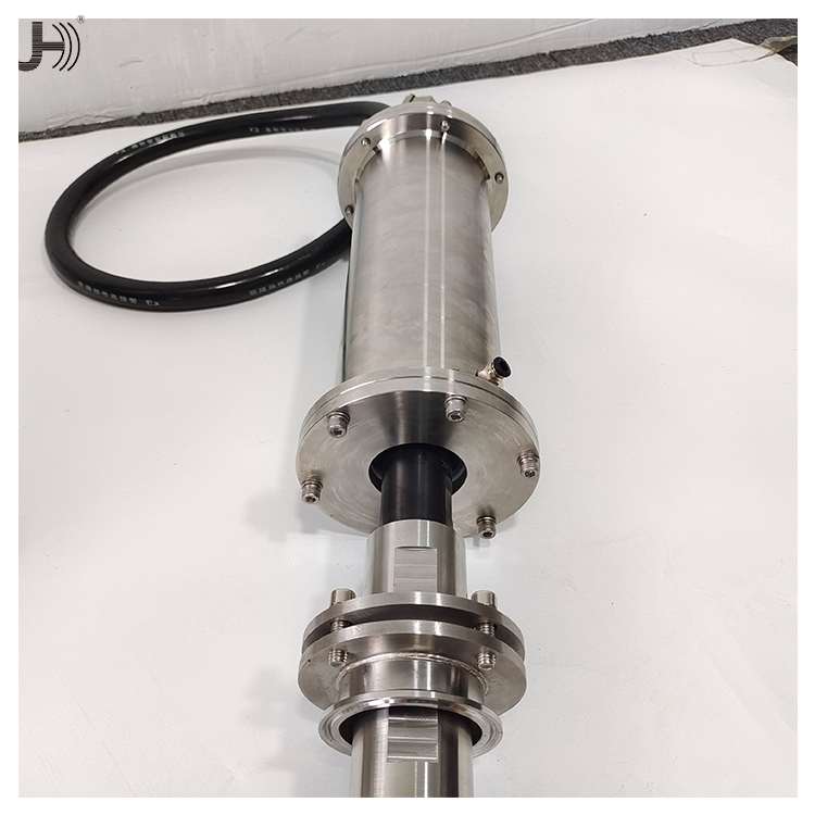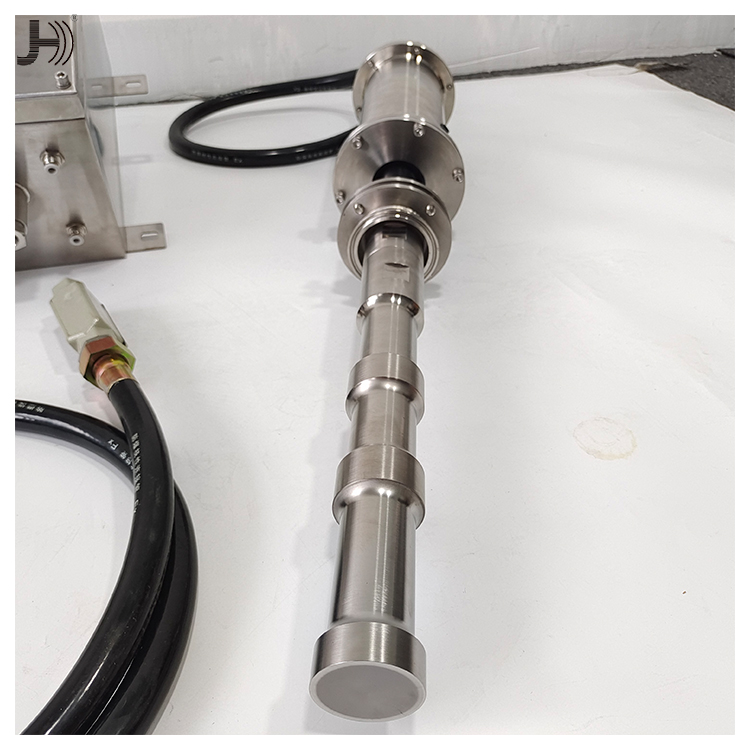 超声波防爆式大功率搅拌机适用于各种溶液,包括高粘度溶液。常规 功率为1.0kW至3.0kW。颗粒可以分散到纳米级。工业应用通常将不 同的液体或固体与液体混合以配制各种产品。如:液体饮料/药品, 油漆,涂料,洗涤剂等。为了更好地将各种物质混合到溶液中,有必 要将最初附聚的物质分散到一个分散体中。超声空化以每秒20000次 的振动在液体中形成无数个高压区和低压区,这些高低压区不断相互 碰撞形成强大的微击波,产生强大的剪切力,促使聚合物解聚。