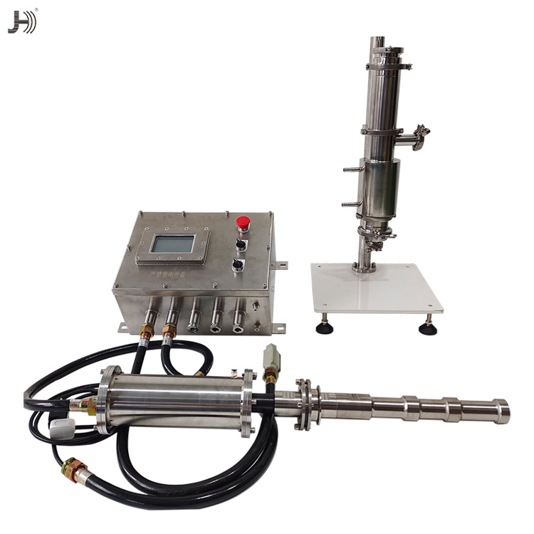 大功率振动棒工业防爆超声波搅拌设备适用于各种溶液,包括高粘度溶液。常规功率为1.0kW至3.0kW。颗粒可以分散到纳米级。工业应用通常将不同的液体或固体与液体混合以配制各种产品。如:液体饮料/药品,油漆,涂料,洗涤剂等。为了更好地将各种物质混合到溶液中,有必要将最初附聚的物质分散到一个分散体中。超声空化以每秒20000次的振动在液体中形成无数个高压区和低压区,这些高低压区不断相互碰撞形成强大的微击波,产生强大的剪切力,促使聚合物解聚。
