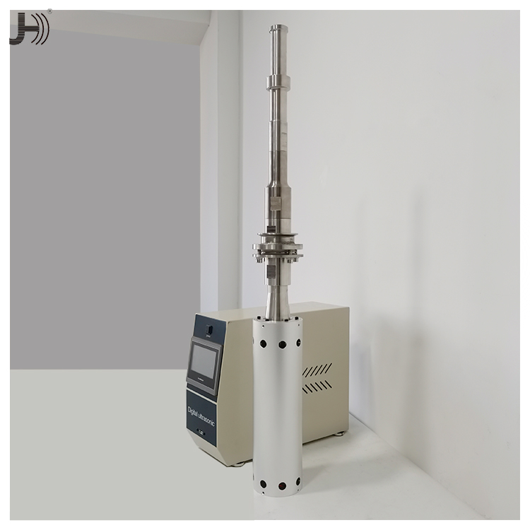 超声波声化学处理搅拌棒适用于各种溶液,包括高粘度溶液。常规功率为1.0kW至3.0kW。颗粒可以分散到纳米级。工业应用通常将不同的液体或固体与液体混合以配制各种产品。如:液体饮料/药品,油漆,涂料,洗涤剂等。为了更好地将各种物质混合到溶液中,有必要将最初附聚的物质分散到一个分散体中。超声空化以每秒20000次的振动在液体中形成无数个高压区和低压区,这些高低压区不断相互碰撞形成强大的微击波,产生强大的剪切力,促使聚合物解聚。