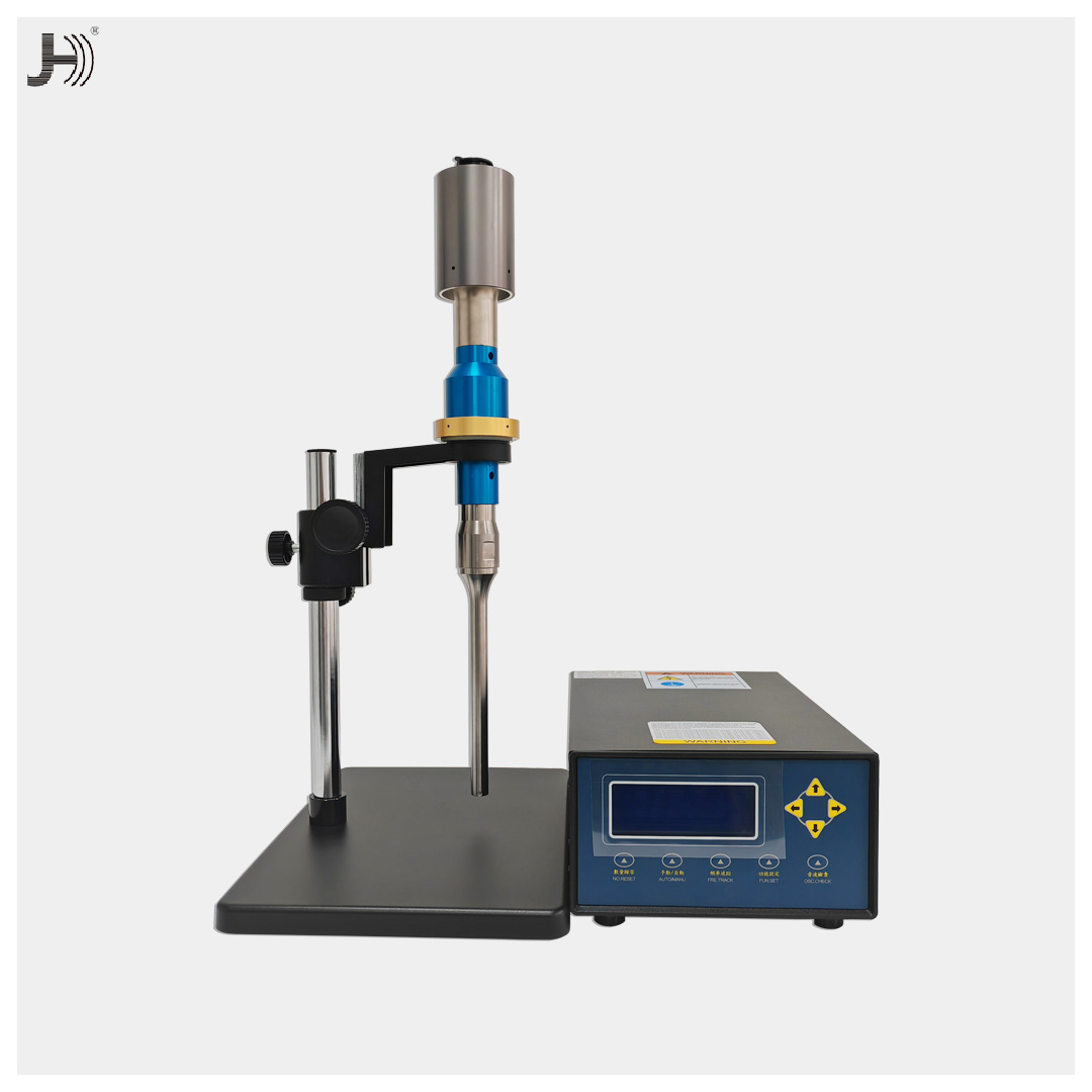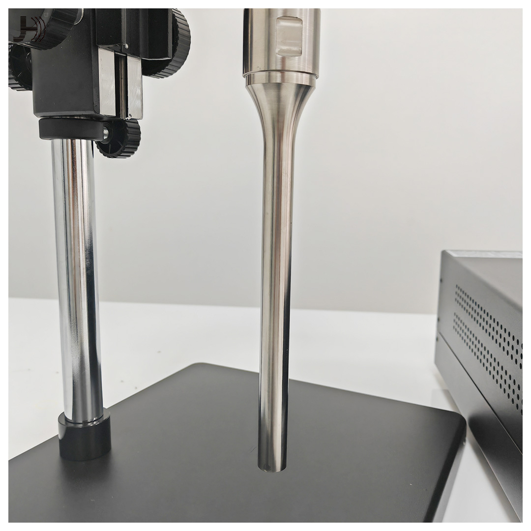 工具头长度262mm超声搅拌器适用于各种溶液,包括高粘度溶液。常规功率为1.0kW至3.0kW。颗粒可以分散到纳米级。工业应用通常将不同的液体或固体与液体混合以配制各种产品。如:液体饮料/药品,油漆,涂料,洗涤剂等。为了更好地将各种物质混合到溶液中,有必要将最初附聚的物质分散到一个分散体中。超声空化以每秒20000次的振动在液体中形成无数个高压区和低压区,这些高低压区不断相互碰撞形成强大的微击波,产生强大的剪切力,促使聚合物解聚。