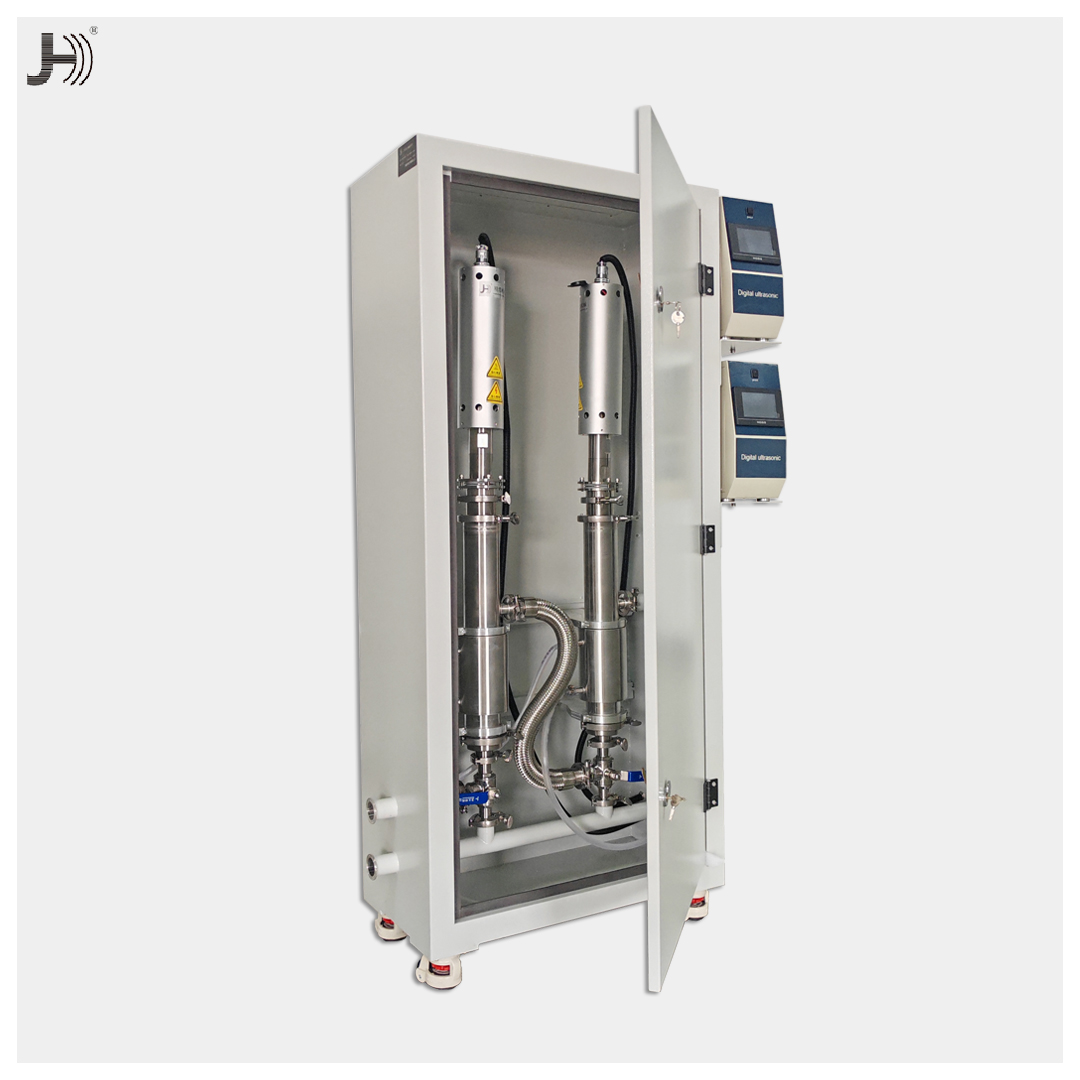 超声搅拌溶媒液体处理分散设备适用于各种溶液,包括高粘度溶液。常规功率为1.0kW至3.0kW。颗粒可以分散到纳米级。工业应用通常将不同的液体或固体与液体混合以配制各种产品。如:液体饮料/药品,油漆,涂料,洗涤剂等。为了更好地将各种物质混合到溶液中,有必要将最初附聚的物质分散到一个分散体中。超声空化以每秒20000次的振动在液体中形成无数个高压区和低压区,这些高低压区不断相互碰撞形成强大的微击波,产生强大的剪切力,促使聚合物解聚。