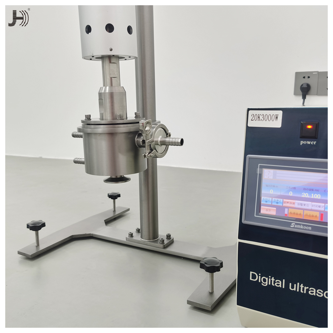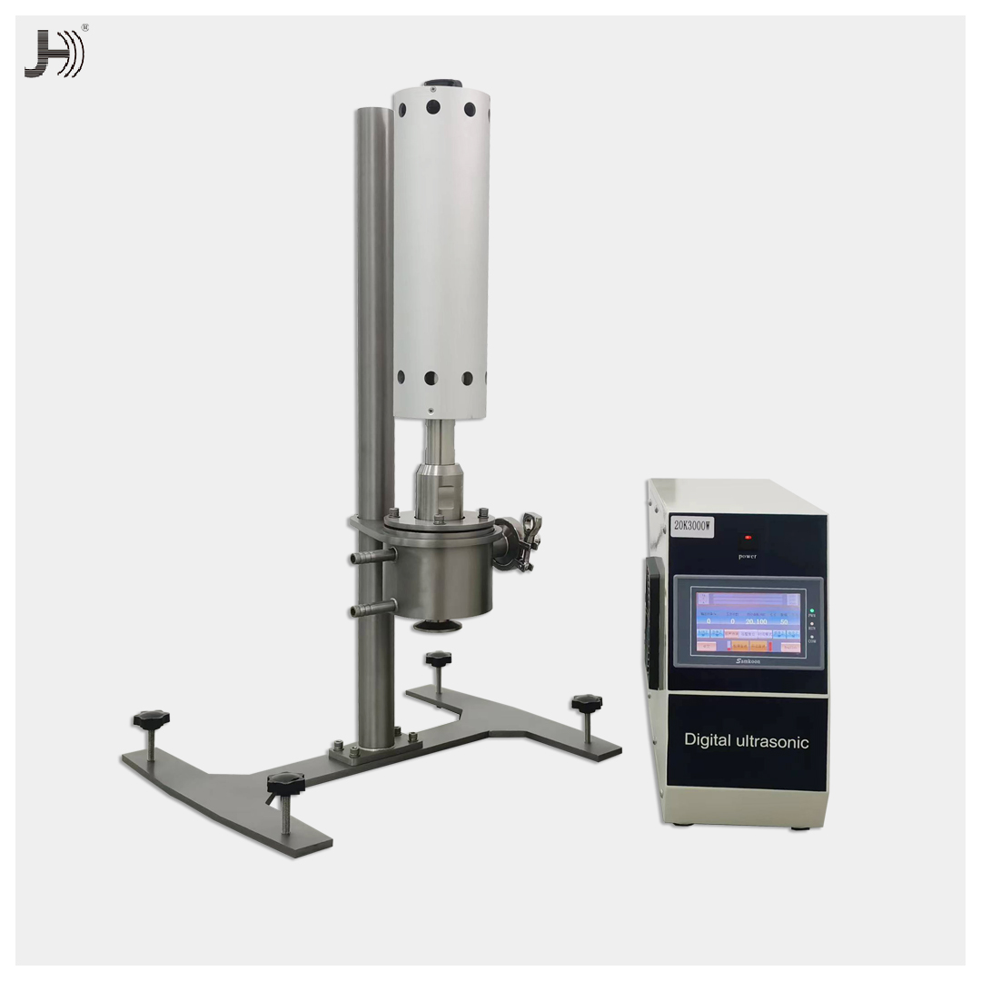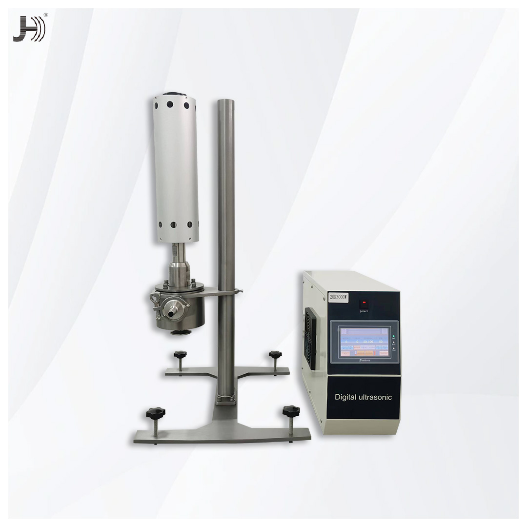 小型超声波搅拌器适用于各种溶液,包括高粘度溶液。常规功率为1.0kW至3.0kW。颗粒可以分散到纳米级。工业应用通常将不同的液体或固体与液体混合以配制各种产品。如:液体饮料/药品,油漆,涂料,洗涤剂等。为了更好地将各种物质混合到溶液中,有必要将最初附聚的物质分散到一个分散体中。超声空化以每秒20000次的振动在液体中形成无数个高压区和低压区,这些高低压区不断相互碰撞形成强大的微击波,产生强大的剪切力,促使聚合物解聚。